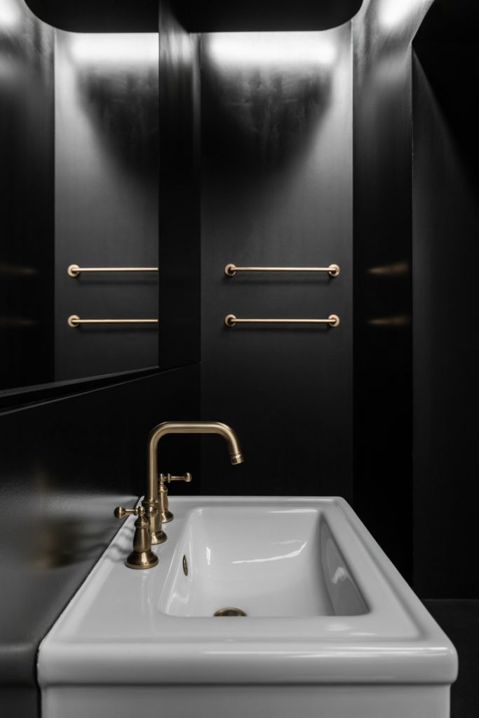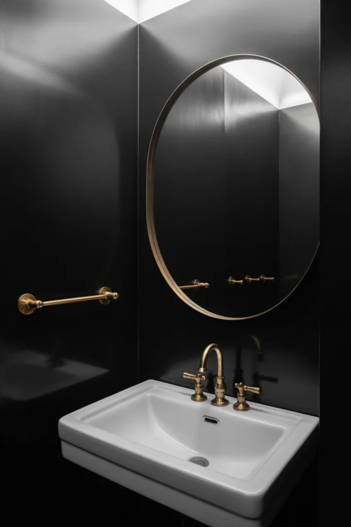A dramatic black bathroom is striking and luxurious, especially in dark powder rooms or compact spaces where mood lighting shines. Pairing white countertops with matte black tiles creates a sense of drama, while gold or brass fixtures add warmth. Many designers suggest this look for small half baths, where boldness doesn’t overwhelm but instead creates a memorable guest experience.