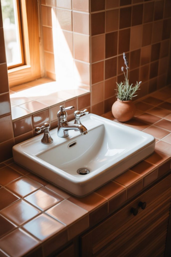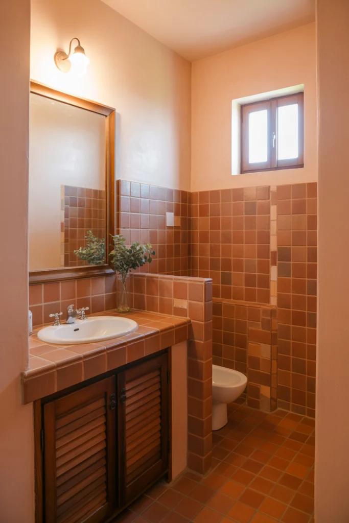 Earthy terracotta is making its way into bathrooms, adding warmth and depth to even a tiny space. Paired with white sinks and natural wood vanities, the look feels Mediterranean and cozy. Designers point out that terracotta tiles or paint are especially welcoming in guest baths where warmth sets the tone.