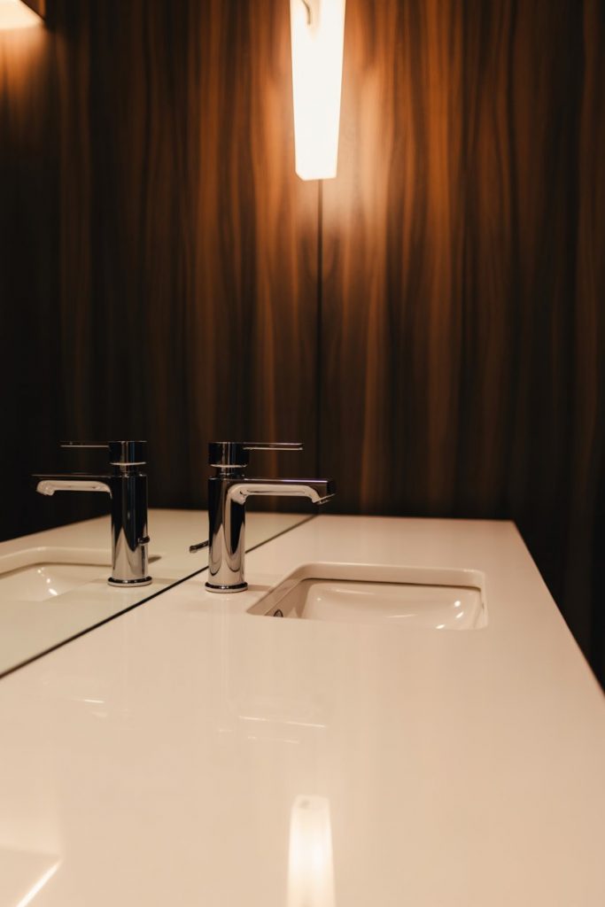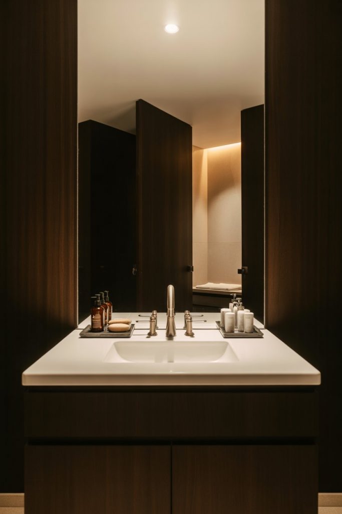Rich dark wood cabinetry and wall panels bring a dramatic yet natural feel to 2026 bathrooms. This style adds gravitas to ensuite and jack and jill bathrooms alike. Experts emphasize that dark wood pairs beautifully with white countertops and warm lighting for balance.