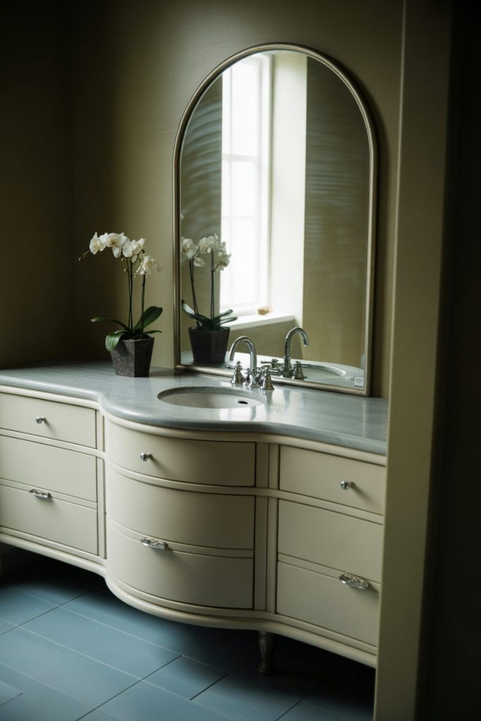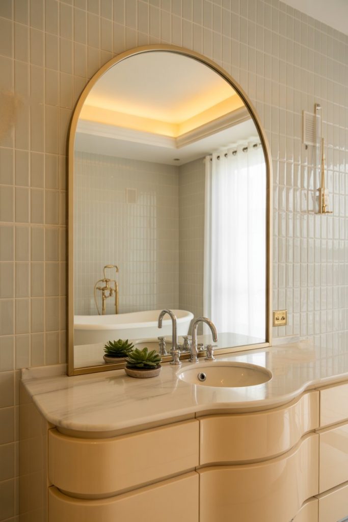 Sharp lines are giving way to curved vanities, mirrors, and showers. These rounded shapes make small half and tiny baths feel softer and more welcoming. Designers like Kelly Wearstler highlight how curves create a sense of flow and visual comfort.