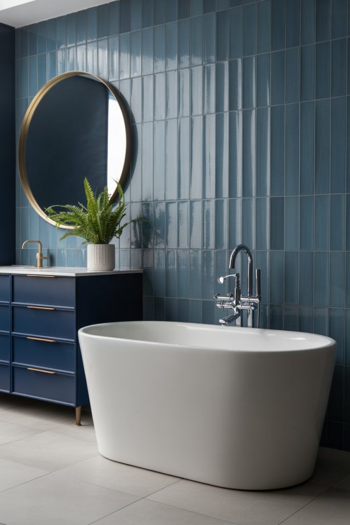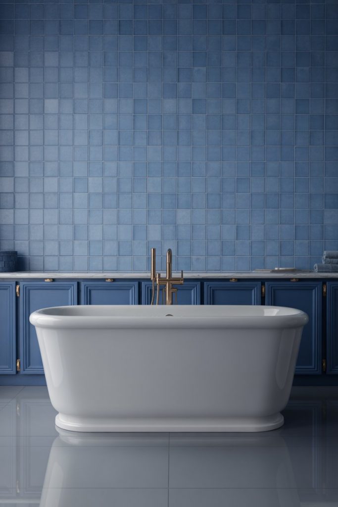 Deep blue tones are taking center stage, especially in modern bathrooms with minimalist layouts. Navy cabinetry or bold cobalt tiles add sophistication without feeling overwhelming. A jack and jill bathroom painted in blue creates continuity between shared spaces while still feeling elegant. According to Houzz design pros, pairing blue with brushed gold hardware makes even small full baths look rich and stylish.