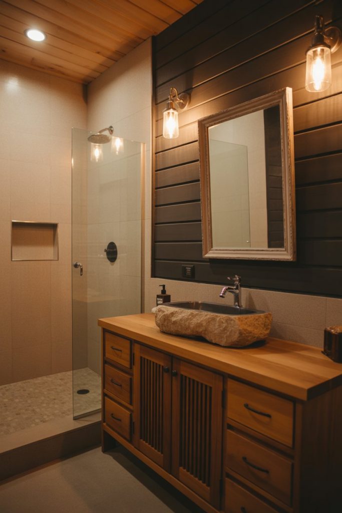 For those who love warmth and texture, rustic bathrooms continue to shine in 2026. Natural wood vanities, exposed beams, and stone sinks bring character to even a half bath. A dark accent wall or aged copper fixture adds depth and makes the room feel both lived-in and timeless. As Joanna Gaines has shown on Magnolia, rustic elements blend beautifully with modern minimalism for a balanced look.