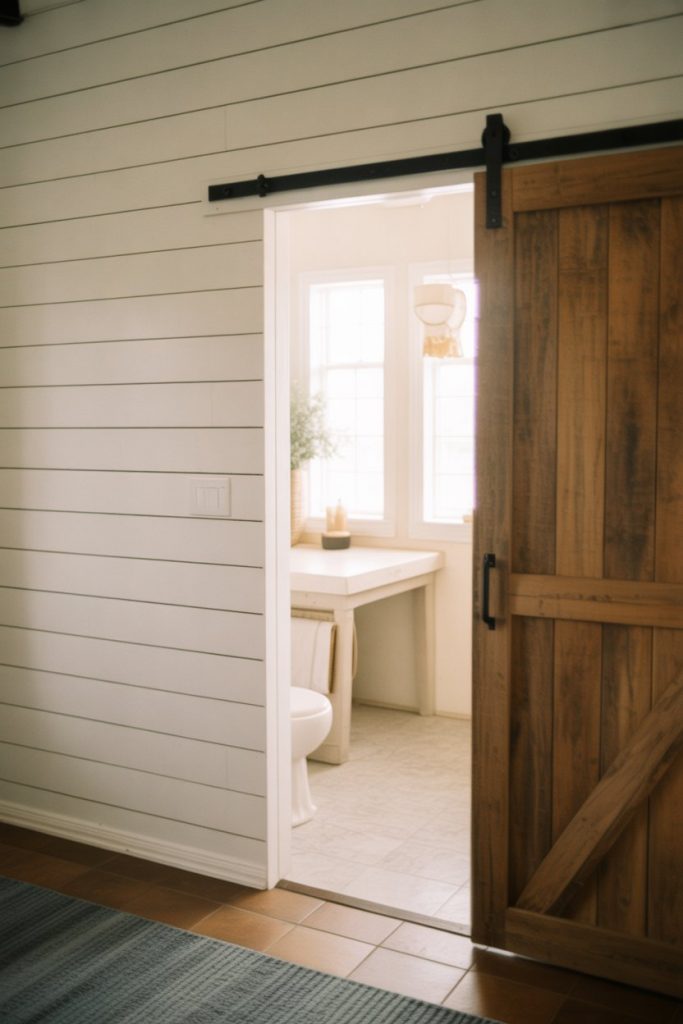 Where it works best: Narrow hallways, basement bathrooms, or any space where door swing clearance is an issue. Just keep in mind that barn doors don’t seal as tightly as traditional doors, so they’re not ideal if sound privacy is a top concern. Use soft-close hardware to prevent slamming, and consider adding a small privacy lock if the bathroom will be used by guests.