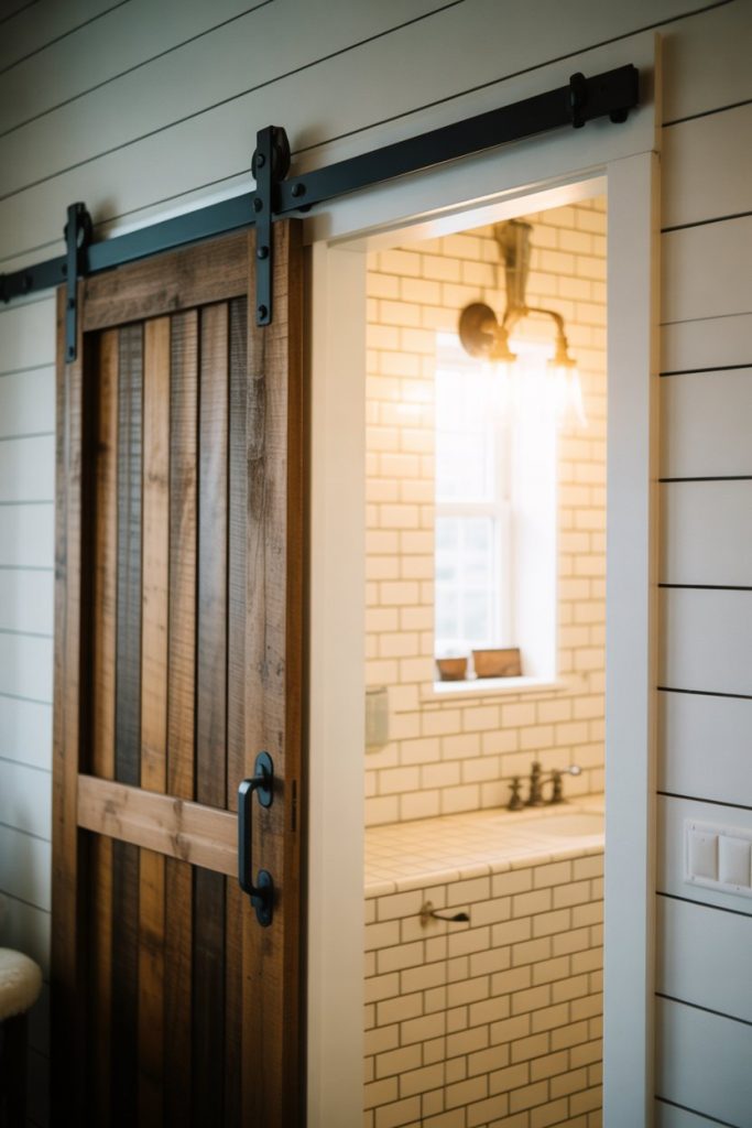 In tiny bathrooms where a swinging door eats up precious floor space, a sliding barn door offers a simple, stylish solution that’s become especially popular in farmhouse-style renovations and RV conversions. The barn door hardware is widely available, relatively cheap, and can be installed as a DIY project in a single afternoon. It also adds texture and visual interest to what’s often a blank wall.