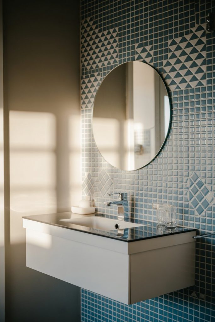 Creating a mosaic tile accent wall behind the vanity or in the shower is a way to inject color and pattern into an otherwise basic bathroom, and it’s a popular inspo for homeowners who want a custom look without renovating the entire room. Small-format tiles like penny rounds, hexagons, or glass mosaics add texture and visual interest while still feeling cohesive when paired with neutral field tiles. This idea works beautifully in both modern and traditional settings.