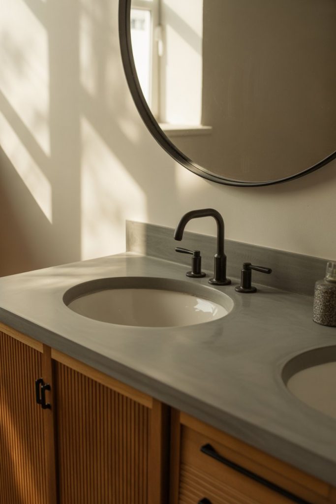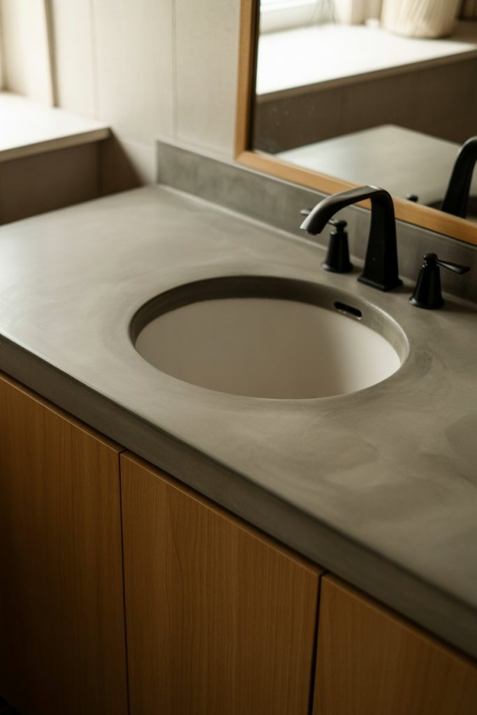 Poured concrete countertops bring an industrial, modern edge to bathroom vanities, and they’re surprisingly customizable in terms of color, finish, and edge detail. This idea has gained traction among homeowners renovating loft-style apartments or contemporary homes where raw materials are celebrated rather than concealed. Concrete is durable, heat-resistant, and can be sealed to resist water and stains, making it practical as well as stylish.