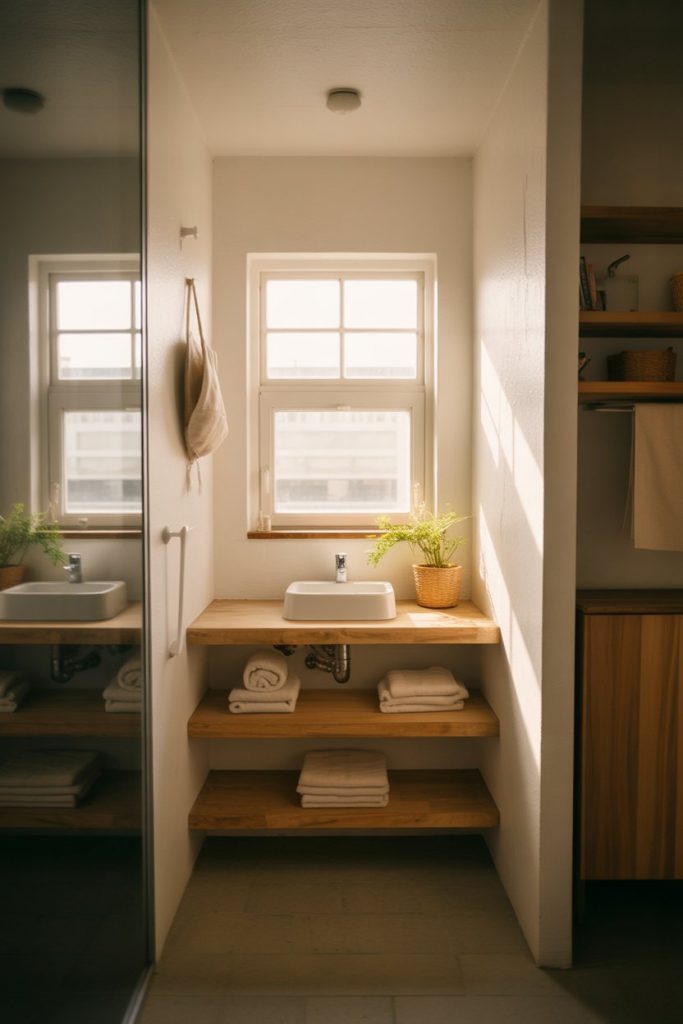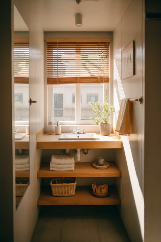 In tiny bathrooms where every inch counts, replacing a bulky cabinet with open shelving creates the illusion of more space while keeping essentials within reach. This simple design move works especially well in modern renovations where minimalism is the goal, and it gives you the flexibility to display attractive baskets, folded towels, or cheap thrifted décor. The visual lightness of open shelves can make even the smallest powder room feel more breathable.