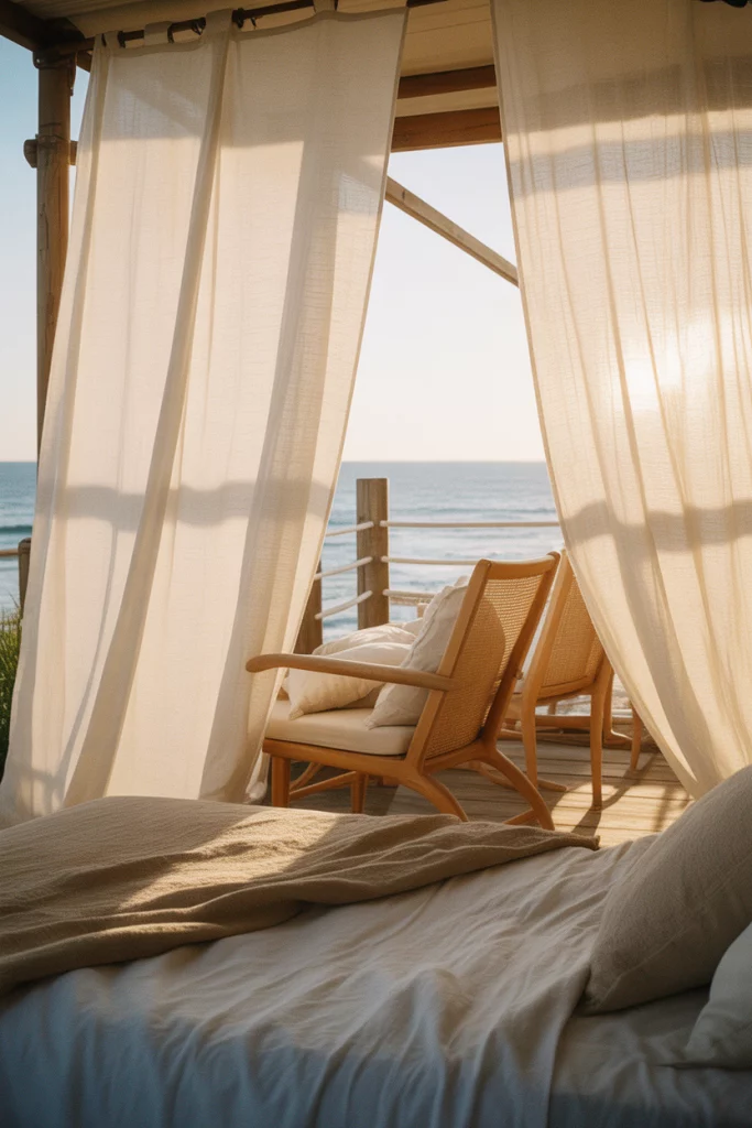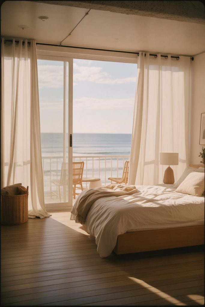 In a coastal loft with big windows and plenty of natural light, floor-to-ceiling white sheer curtains create an ethereal, almost dreamlike atmosphere. They move with the breeze, soften harsh sunlight, and make the space feel larger and more open. The sheers also provide just enough privacy without blocking the view, which is crucial when you’re paying for a water view or skyline.