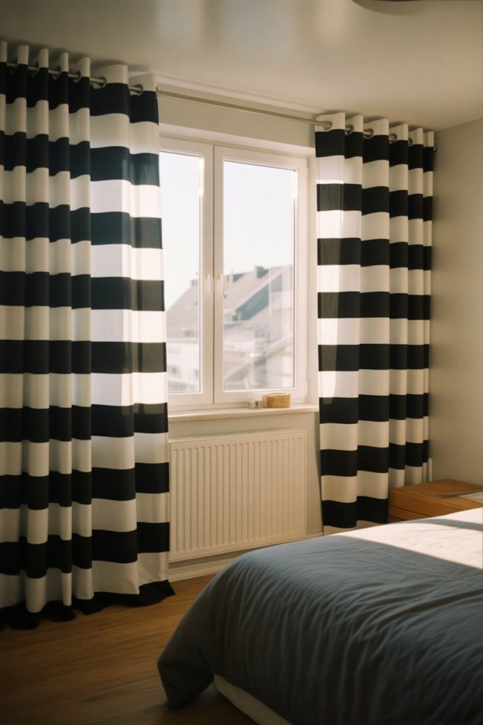 If you want your curtains to make a statement, black and white stripes deliver instant graphic punch. This pattern works especially well in modern or aesthetic bedrooms where clean lines and bold contrasts are already part of the design language. The stripes also have a way of making ceilings look higher and windows look wider, which is a nice bonus in smaller spaces.