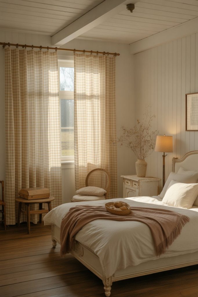There’s a reason farmhouse style never really goes away, and gingham curtains in neutral tones are a big part of that staying power. The gentle checkered pattern adds visual interest without overwhelming the space, and the cream-and-taupe palette keeps things warm and inviting. These work beautifully in country homes, but they’re also showing up in suburban bedrooms where people want a touch of nostalgia without going full rustic.