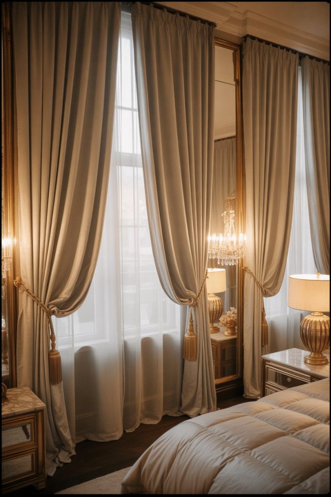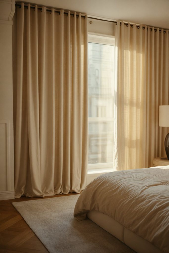 When you’re designing a master modern luxury bedroom, neutral silk curtains in cream or champagne are the ultimate indulgence. Silk has a subtle sheen that catches light beautifully, and the fabric drapes in a way that feels effortlessly elegant. This is the kind of detail that elevates a room from nice to truly special, and it’s worth the investment if you’re going for a high-end look.