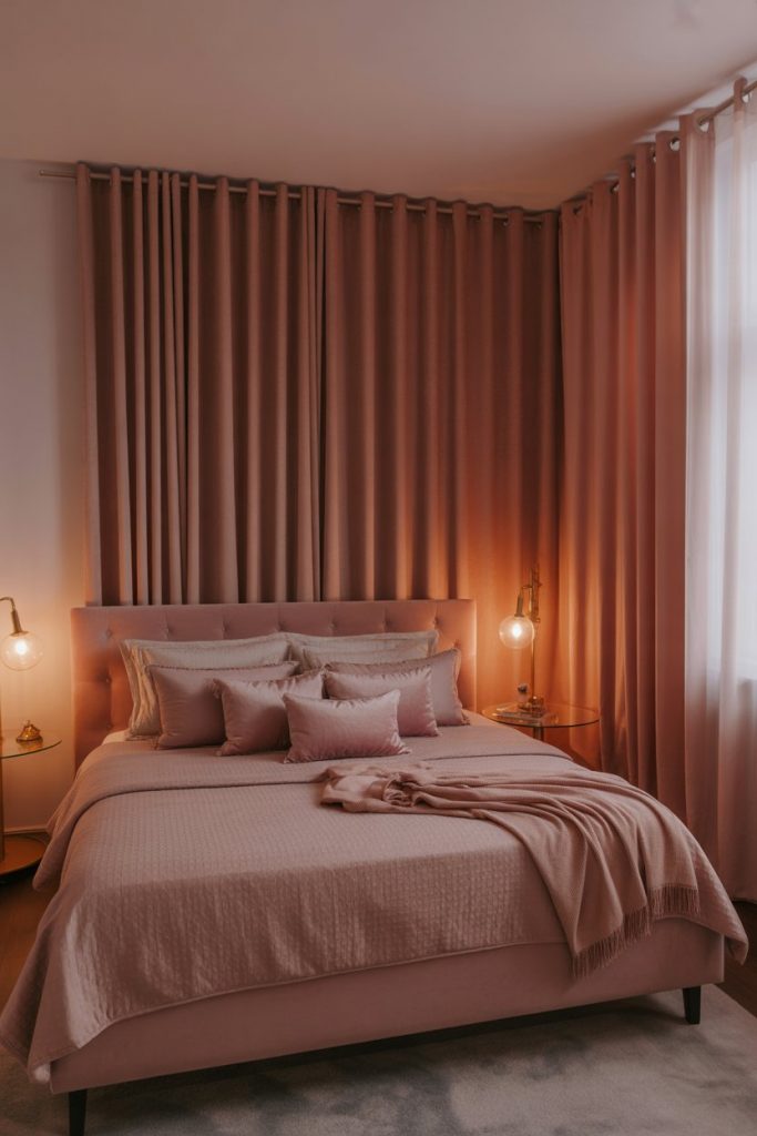 Dusty rose velvet curtains bring a romantic, grown-up take on pink that feels worlds away from bubblegum or baby nursery vibes. The muted tone pairs beautifully with neutral grays and creams, and the velvet texture adds depth and warmth. This is perfect for anyone who wants a luxury bedroom that still feels personal and inviting rather than hotel-generic.