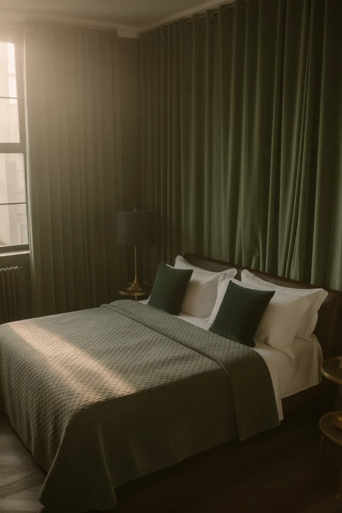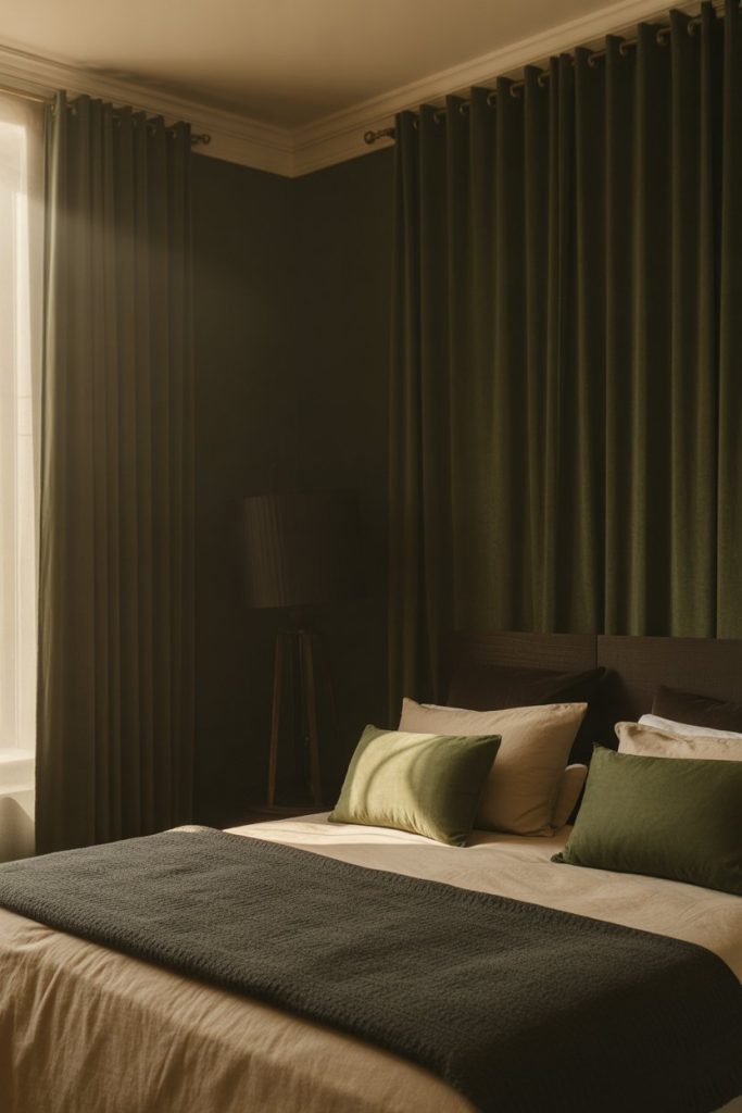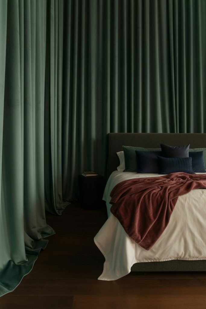 If you’re building a moody master modern bedroom, don’t shy away from deep jewel-tone green velvet curtains. Think emerald, hunter, or even a dark olive that reads almost black in low light. The richness of the fabric and color creates an enveloping, intimate space that feels miles away from the rest of the house. This is a bold move, but when executed well, it’s absolutely stunning.