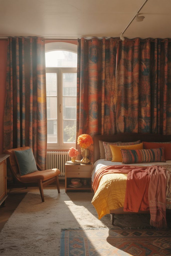 Where this works best: urban apartments, creative studios, and homes where personal expression takes priority over resale value. The trick is balancing the pattern with enough solid elements so the room doesn’t feel chaotic—think solid bedding, a neutral rug, or simple furniture. And if you’re worried about commitment, remember that curtains are one of the easiest things to swap out when you’re ready for a change.