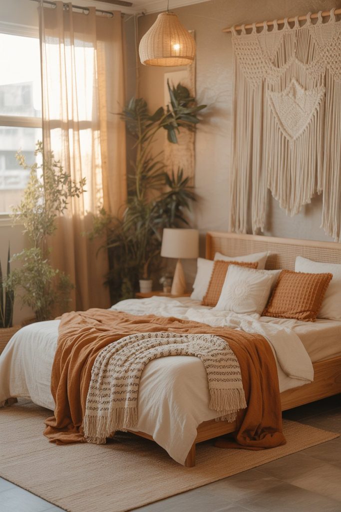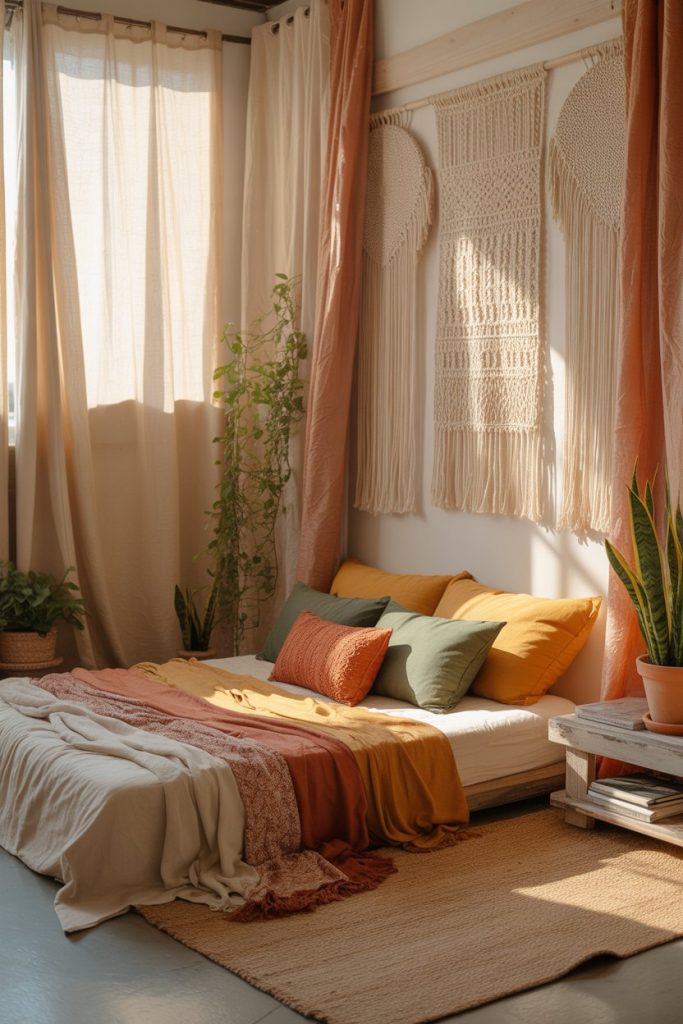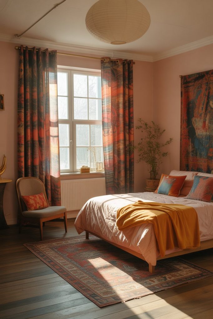 A boho bedroom thrives on layering, and curtains are no exception. Think macramé panels paired with gauzy cotton, or woven hemp curtains hung alongside printed fabrics in rust, terracotta, and mustard. The key is mixing textures and weights so the window becomes a focal point rather than an afterthought. This style loves imperfection, so don’t stress about everything matching perfectly.