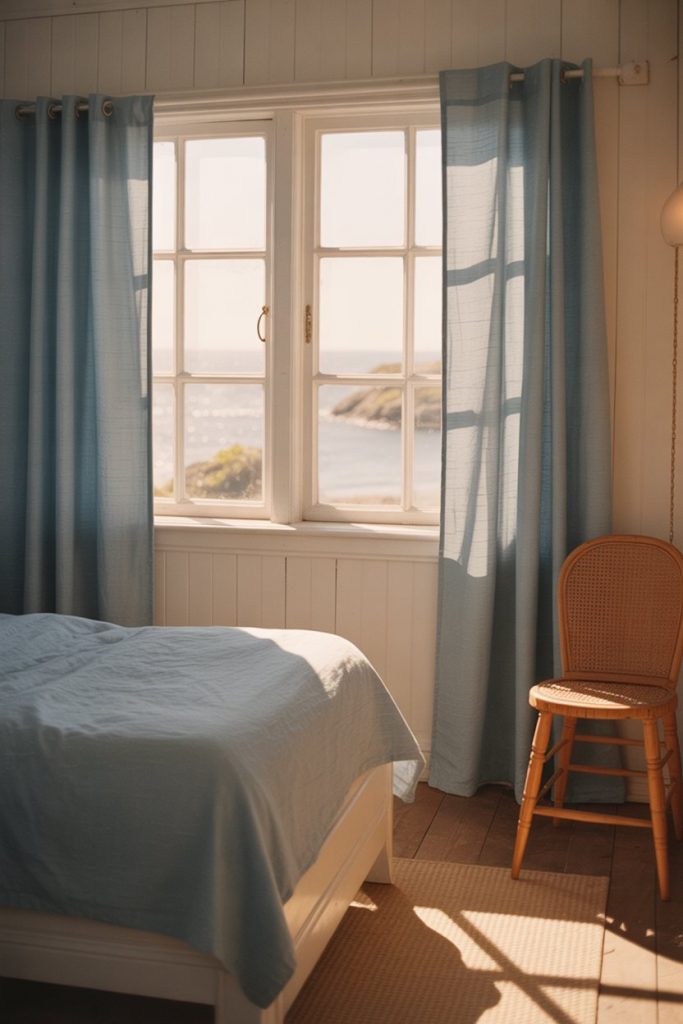Soft blue cotton curtains are a natural fit in a coastal cottage bedroom, where the goal is to evoke sky and sea without feeling too literal. The cotton fabric is breathable and easy to care for, which is key in humid coastal climates where moisture can be an issue. Paired with white trim and natural wood, these curtains create a serene, classic look that never goes out of style.