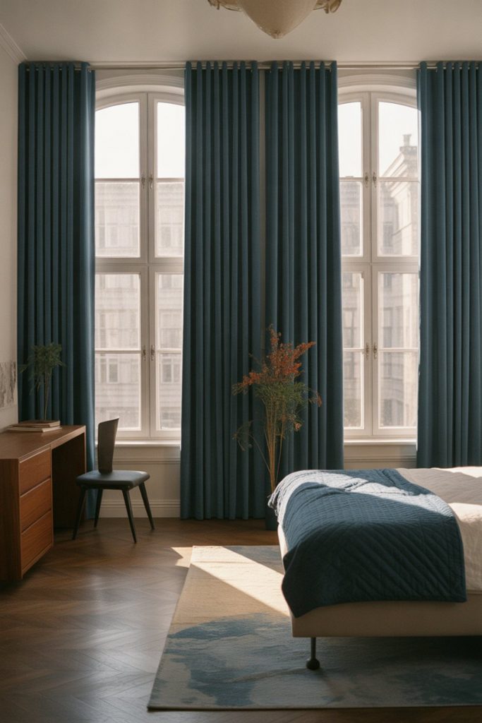 Rooms with high ceilings can sometimes feel cold or cavernous, but blue velvet curtains hung from ceiling to floor bring warmth and scale in one move. The vertical lines draw the eye up, emphasizing the room’s height while grounding it with rich color and texture. This works especially well in modern spaces where clean lines need a little softness to feel complete.