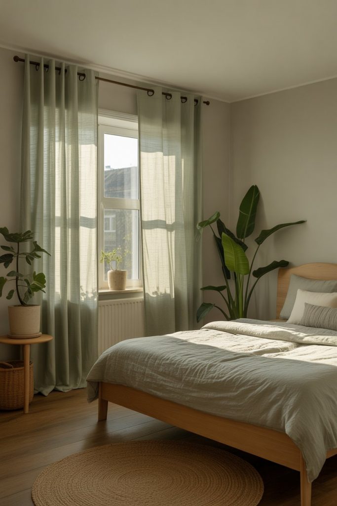 Sage green linen curtains bring an earthy, grounded energy to any bedroom, especially when paired with wood tones and neutral accents. The color reads as calm without being cold, and the linen texture adds just enough visual interest to keep things from feeling flat. This combination is perfect for anyone who wants a space that feels organic and restful without veering into full-on minimalism.