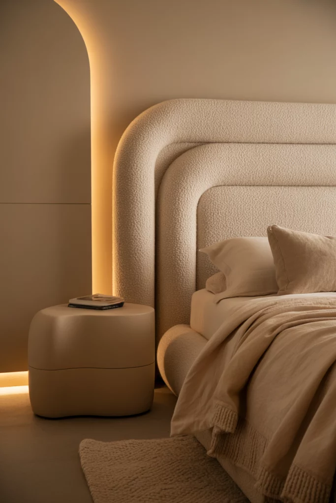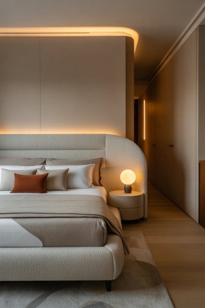 Modern luxury replaces shiny details with soft curves, tactile fabrics, and warm layered light. Boucle headboards, smart-glass windows, and hidden charging ports create quiet refinement. Ideal for new builds or condos where comfort meets prestige, proving that luxury now means softness, not excess.