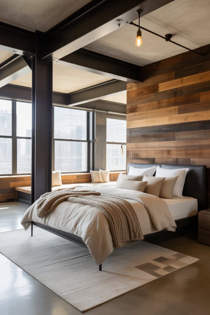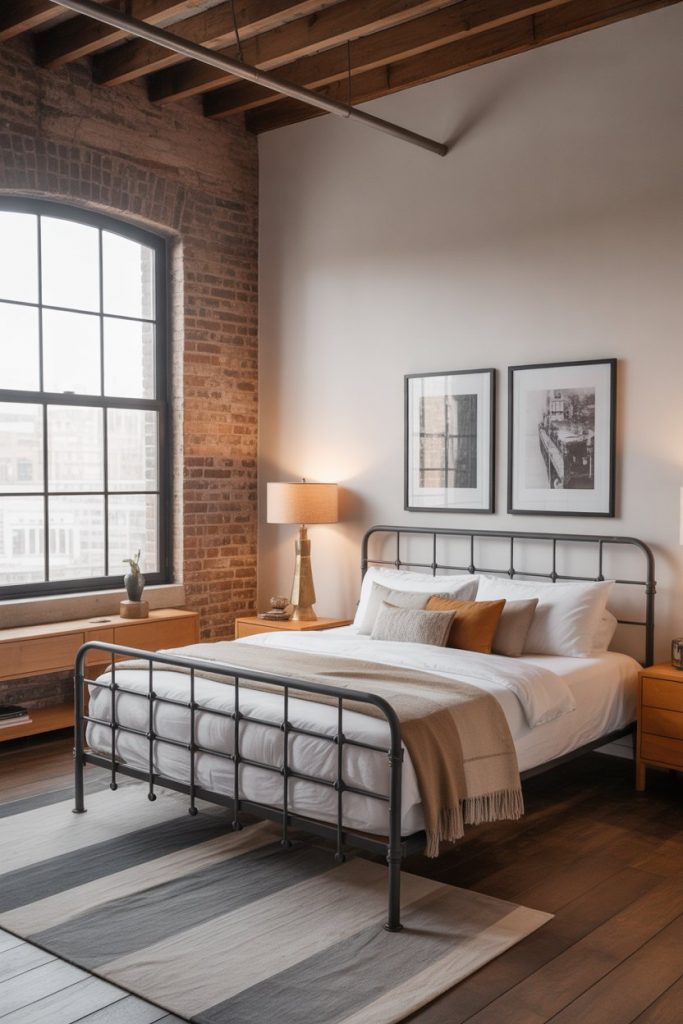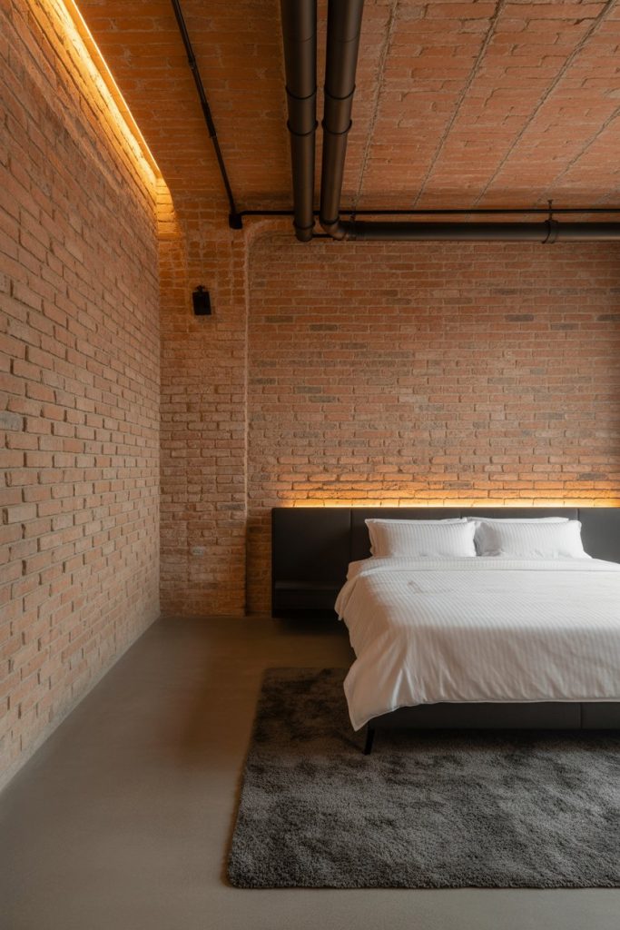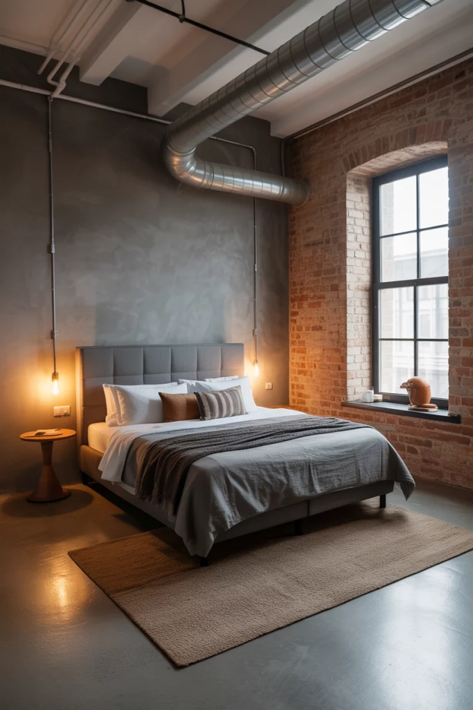 Industrial bedrooms develop in 2026 with softened raw materials. Wool rugs, linen tables, and warm LEDs are added to the existing atmosphere of dry elements like exposed brick, matte steel, and concrete. That design is good for warming up lofts or basements. It keeps the edge without feeling cold.