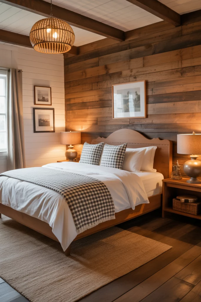 The traditional farmhouse look gains a 2026 upgrade through reclaimed wood, woven textures, and soft gingham patterns. Neutral tones and candlelight-inspired lamps create intimate warmth. Perfect for families or countryside homes, it’s a design that feels both nostalgic and enduring.