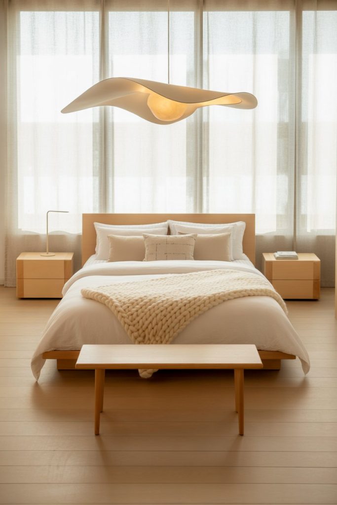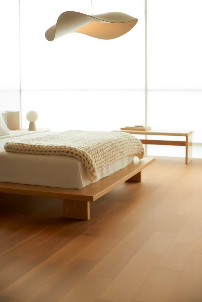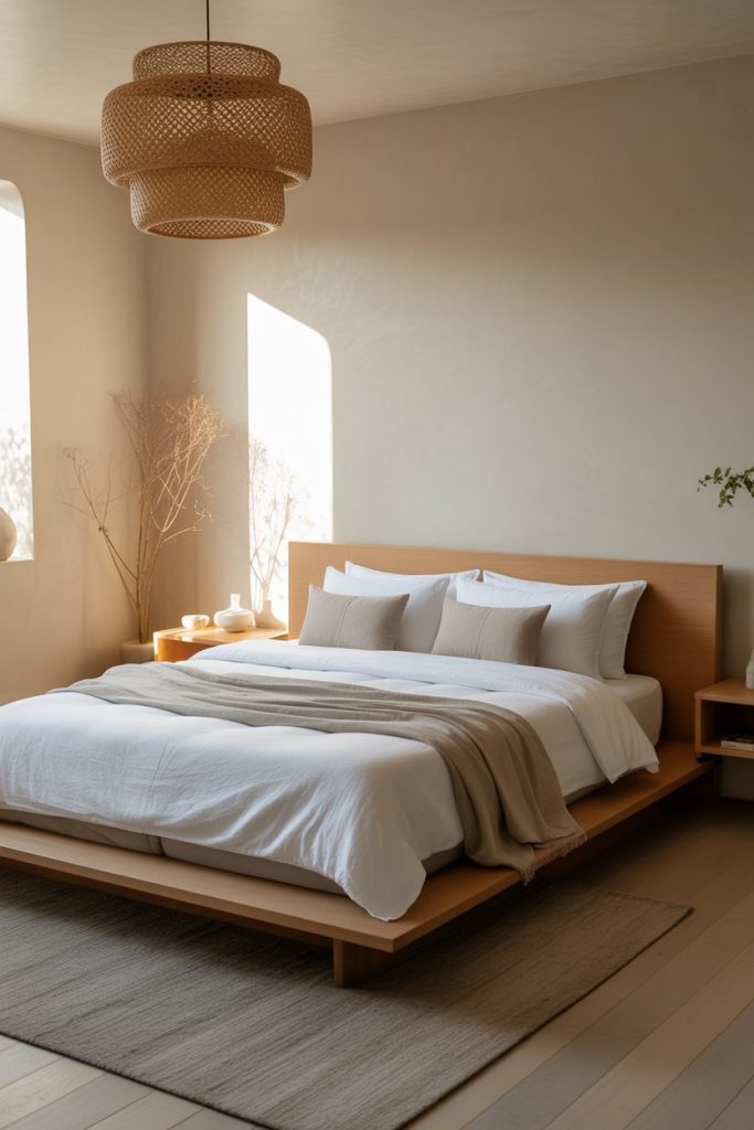 Japandi style combines Japanese wabi-sabi and Scandinavian hygge. It uses pale wood, linen bedding, and low furniture. It supports slow routines and a digital detox, making it a good style for people who need mental calm before bed. It gives the room a decor spa-like peace. Natural textures do the decorating.