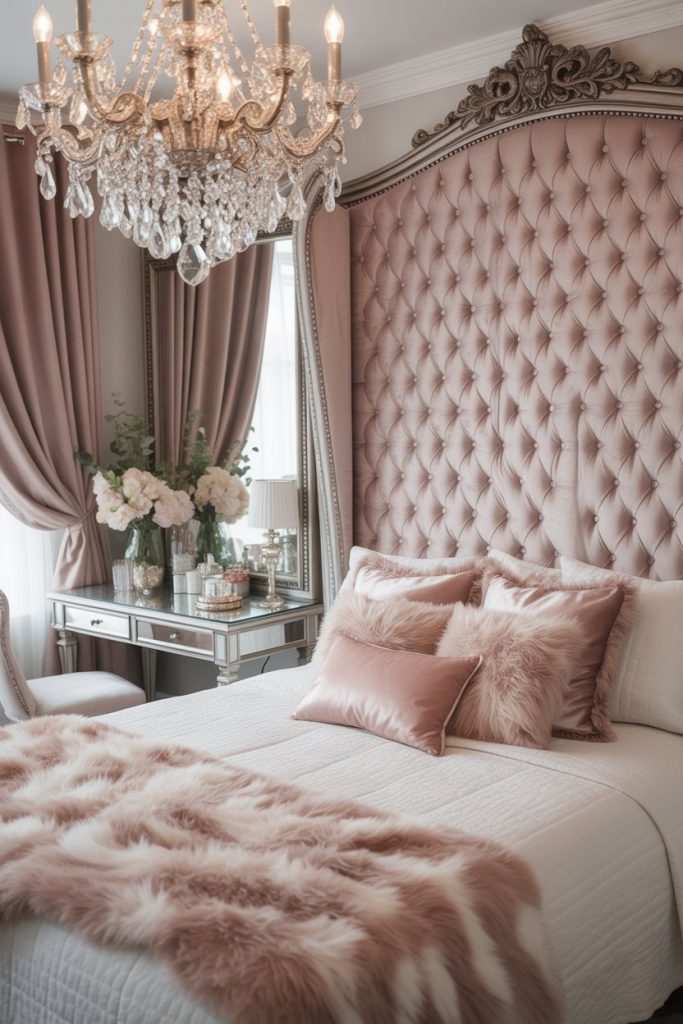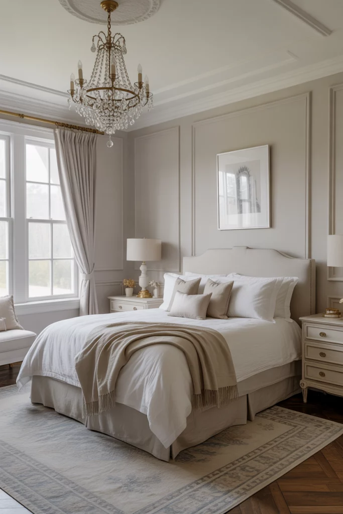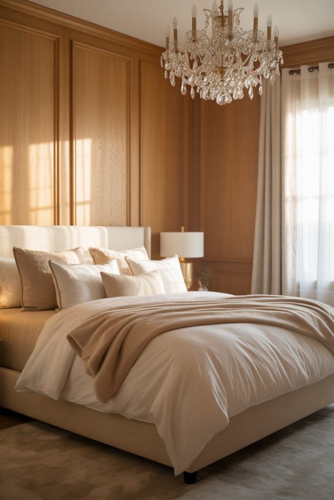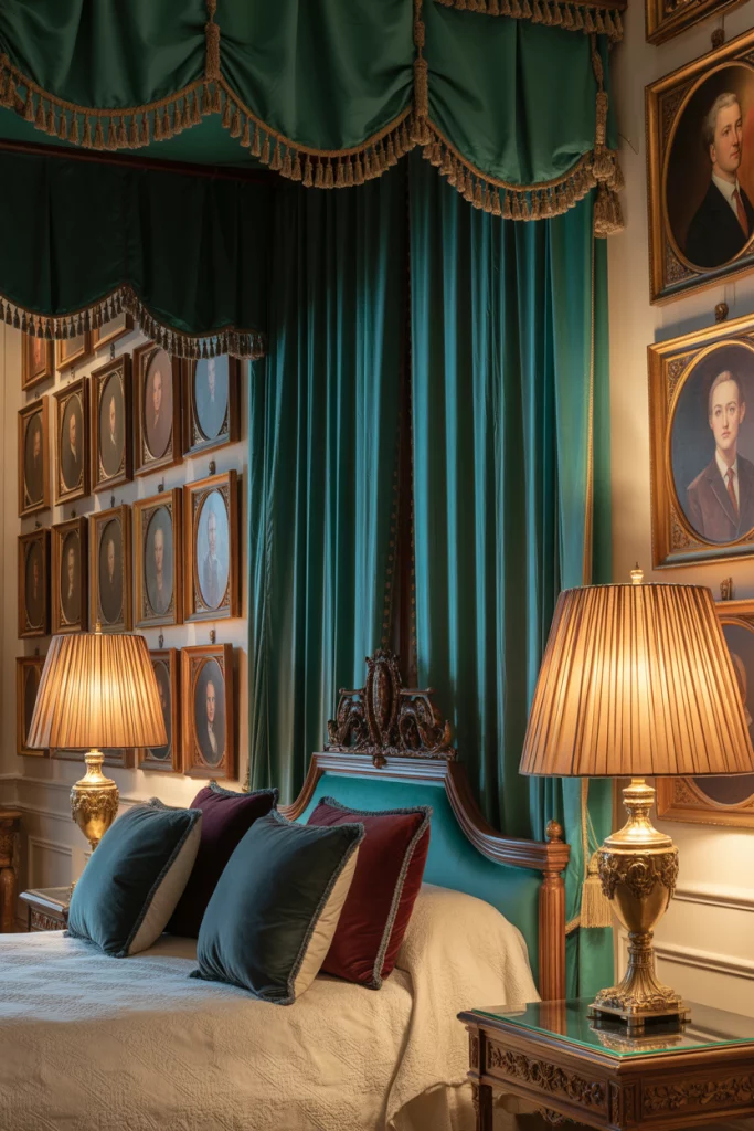 Royal luxury returns in a lighter, curated way—velvet pillows, brass accents, carved wood, and portrait art without heavy drapery. Works best in rooms with high ceilings or classic molding, turning a bedroom into a gentle nod to old-world charm while staying comfortable enough for everyday life.