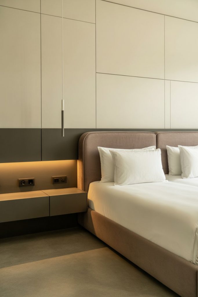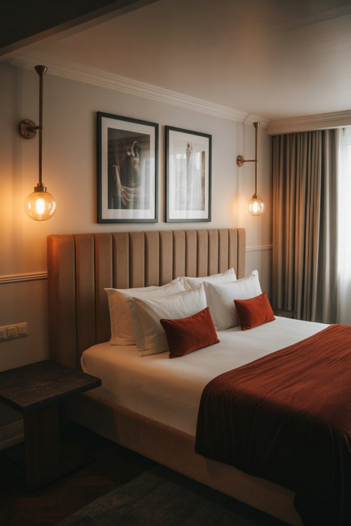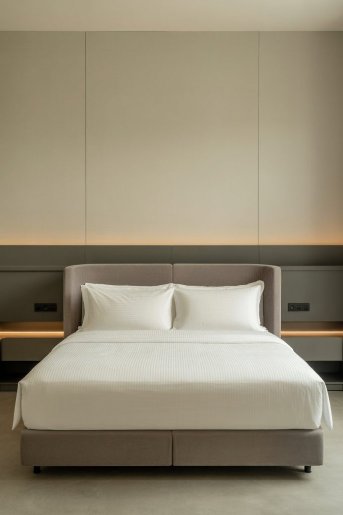 A minimalist room inspired by a boutique hotel uses two colors, one hero light fixture, and built-in nightstands. Clutter disappears, so fabric quality and headboard shape take the spotlight. Ideal for guest rooms or Airbnb rentals where simple luxury boosts both rest and ratings.