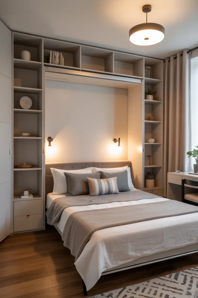 A tiny room can stay stylish with sliding panels, ceiling shelves, and wall-mounted lighting that frees floor space. This layout works for studio apartments, student housing, or guest zones. Minimal multifunction furniture keeps the room uncluttered while still providing comfort. This is a good layout for guest housing and spaces where design still matters.