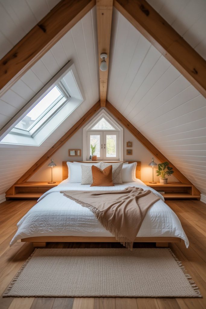 An attic bedroom turns awkward slopes into intimate comfort. Built-in drawers fit under eaves, a skylight sits above the bed, and a dormer niche becomes a morning coffee spot. Ideal for older homes needing extra sleep space while adding storybook character.