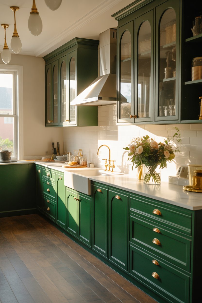 Forest green is bold, earthy, and especially striking with wood cabinets, black cabinets, or even brass accents. This natural like palette is great for homes by a forest or lake or for those that like organic design. The moodiness is at its greatest with the help of warm lighting and if it’s paired with stone or wooden details.