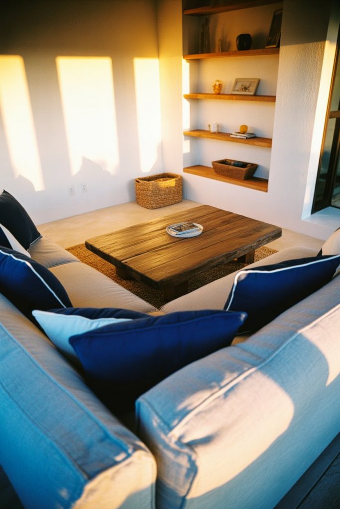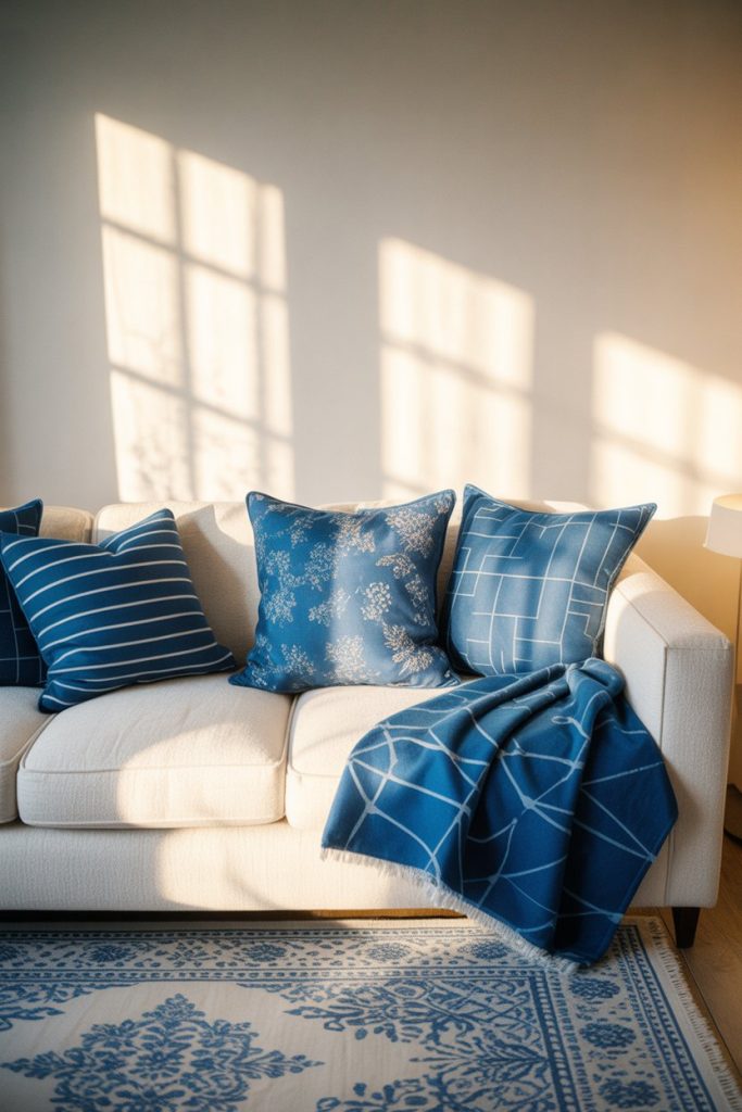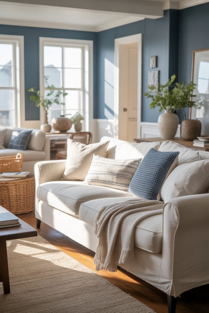 One of the greatest strengths of a blue and white living room is its year-round adaptability—this palette works beautifully across all seasons with just minor accessory changes. In summer, lean into the coastal vibe with lightweight linens and sky blue accents; in winter, add warmth through navy velvet pillows, thick wool throws, and deeper blue tones. The foundational color scheme remains constant, while seasonal touches keep the room feeling fresh and current throughout the year.