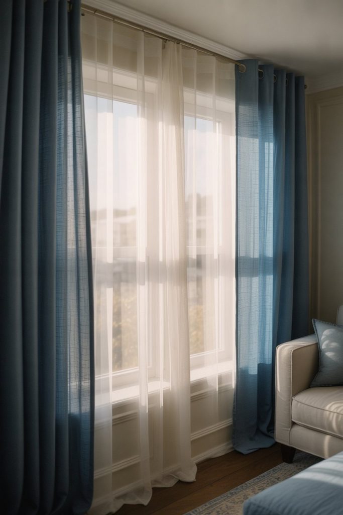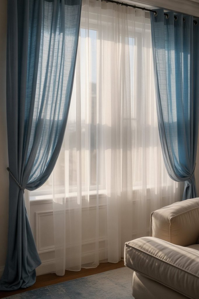 Layering curtains and drapes in complementary shades of blue and white adds luxurious depth to your living room windows. Start with sheer white panels to filter light during the day, then add heavier blue drapes that can be drawn for privacy and warmth in the evening. This combination offers both function and style, allowing you to control light levels while creating a soft, layered look that feels sophisticated and intentional.