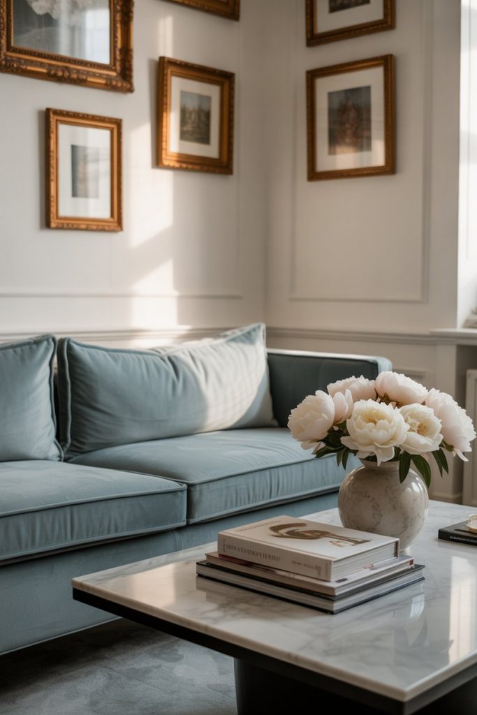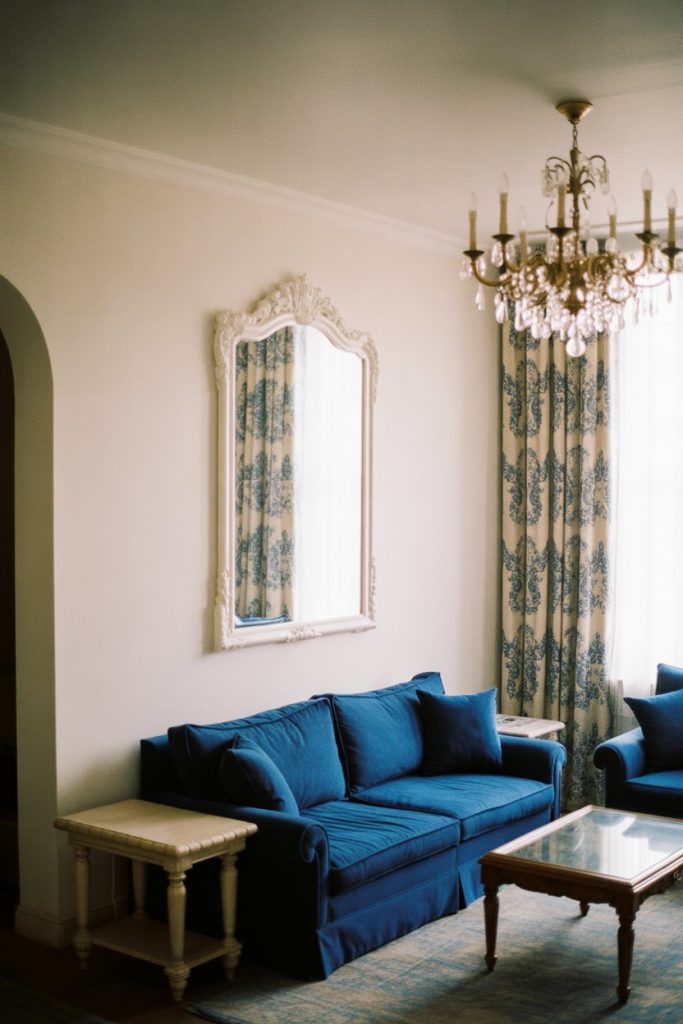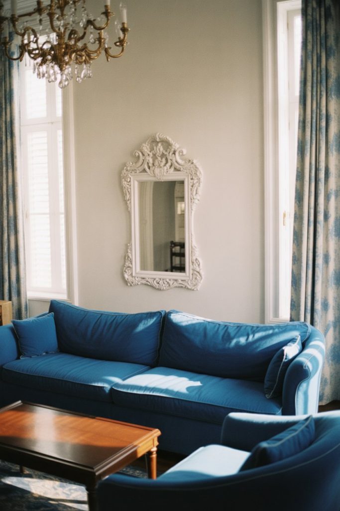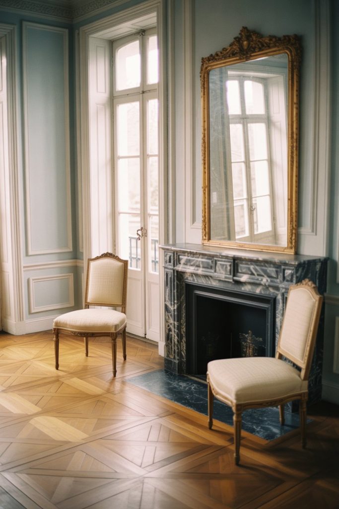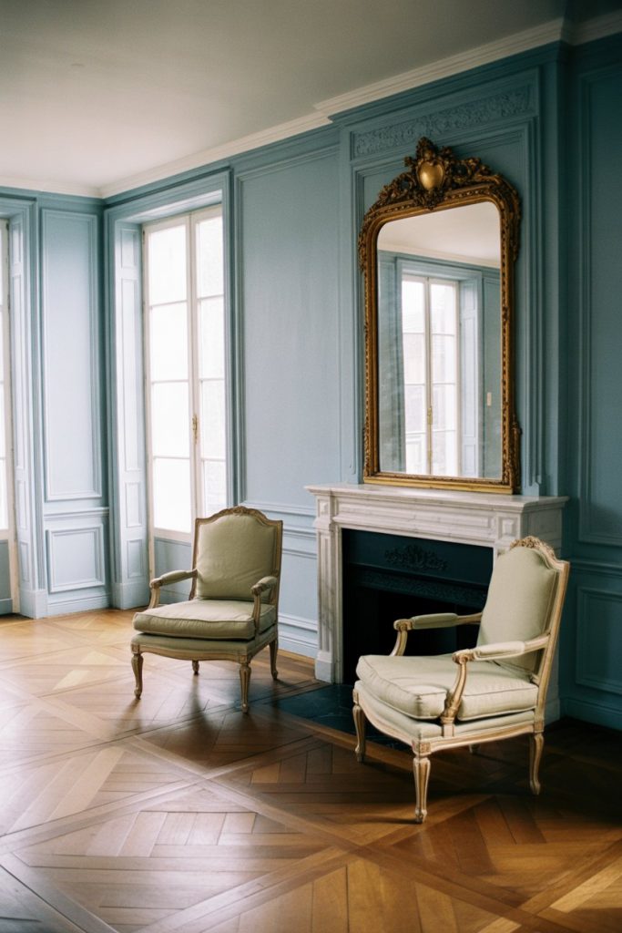 Taking cues from Parisian apartments and countryside châteaux, a French-inspired blue and white living room emphasizes symmetry, quality materials, and restrained elegance. Pair soft blue walls with ornate white molding, position matching bergère chairs flanking a fireplace, and hang an antique mirror above the mantel. The French approach favors fewer, better pieces over abundant decoration, and the result is a room that feels curated, timeless, and effortlessly chic.