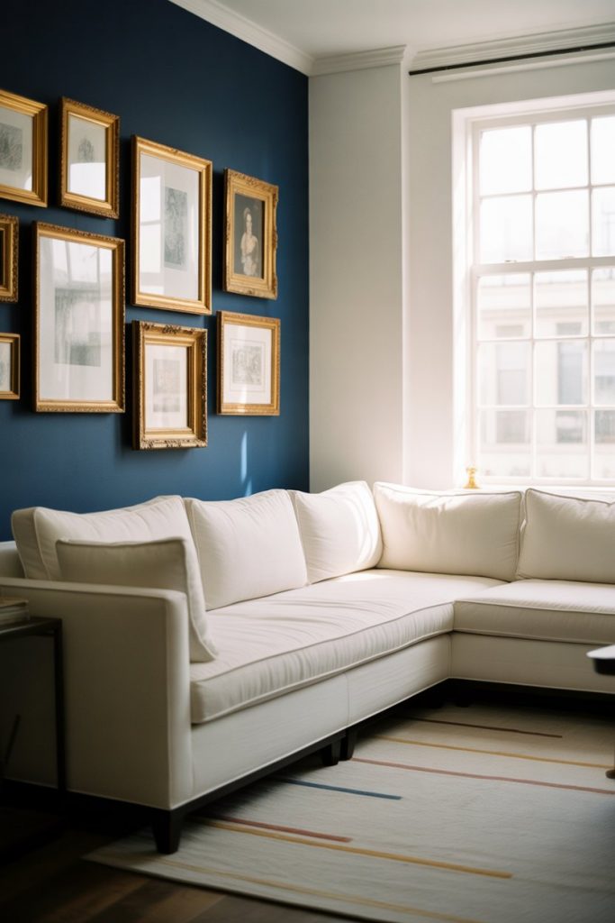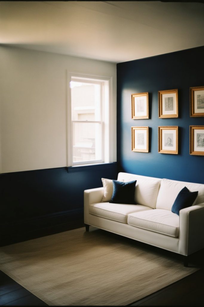 A single navy accent wall in an otherwise white living room creates instant drama and sophistication without overwhelming the space. This approach works particularly well behind a sofa, fireplace, or media center, where the deep blue provides a strong backdrop for lighter furniture and artwork. The contrast between the navy and surrounding white walls adds architectural interest even to basic rectangular rooms, and it’s a commitment-friendly way to experiment with bolder color.