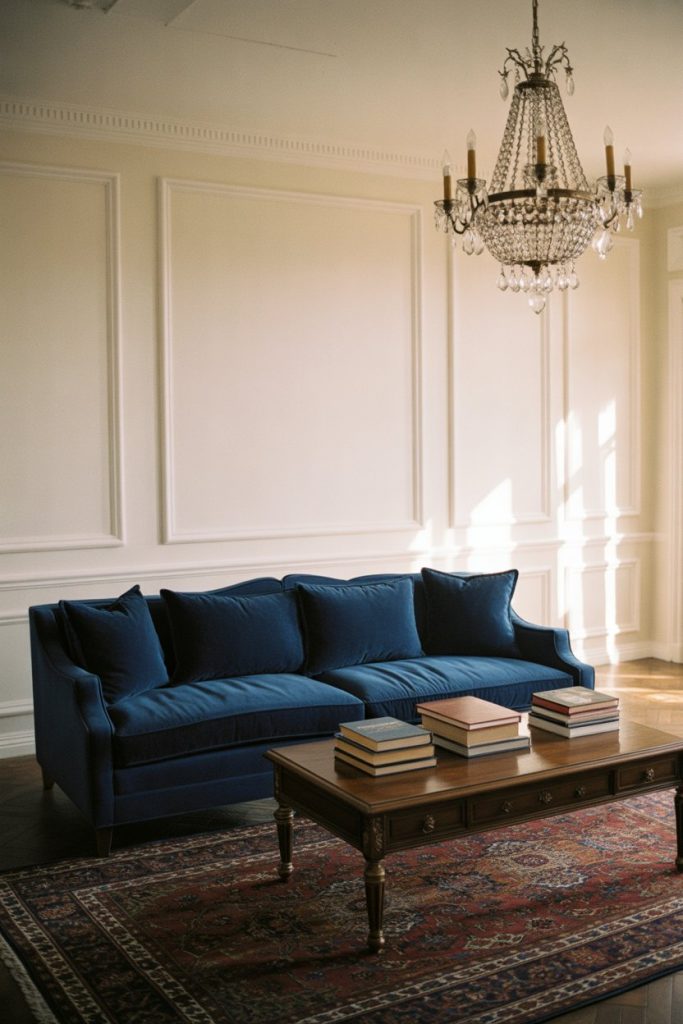 For those who gravitate toward traditional interiors, a navy and ivory palette delivers timeless sophistication without feeling stuffy. Deep navy accent walls or richly upholstered sofas anchor the room, while crisp white trim, crown molding, and ceiling details add architectural interest. This combination works beautifully in formal living rooms or homes with classic proportions, where symmetry and balance are key design principles.