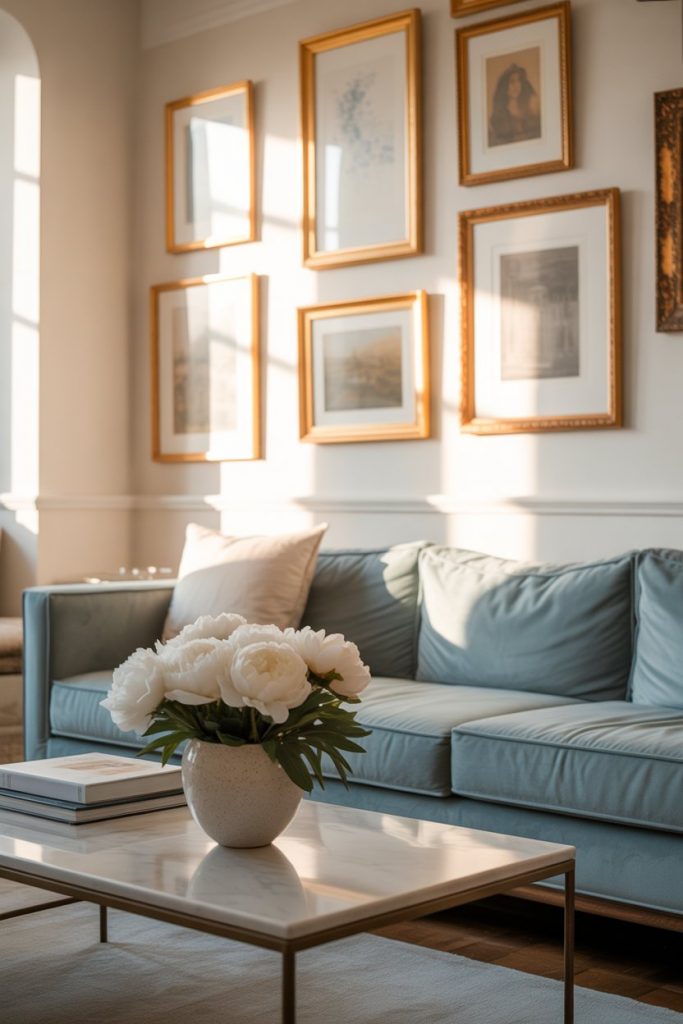 If you’re drawn to that effortlessly chic, Instagram-ready aesthetic, a blue and white living room offers endless possibilities for creating a highly curated look. This style leans on careful styling—artfully arranged coffee table books, perfectly placed pillows, and a gallery wall that looks spontaneous but is actually meticulously planned. The color palette stays soft and serene, with muted blues, creamy whites, and just enough texture to photograph beautifully. It’s designed to look good from every angle.