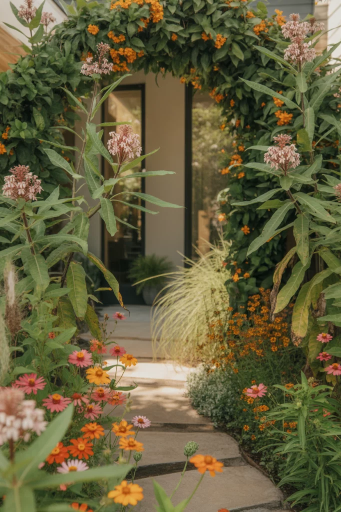 Designing an entry garden around Ideas, Monarch, Ideas landscaping, Design layout, and Theme brings both beauty and meaning to a home. I’ve seen neighbors use these warm orange tones as a welcoming color story, especially when they want an aesthetic space that gently nods to nature. This idea works anywhere—from small suburban yards to long walkways—because it uses plants like milkweed and zinnias to encourage butterflies to stop by. It also feels surprisingly personal, the way a front area can quietly tell visitors what kind of home they’re walking into.