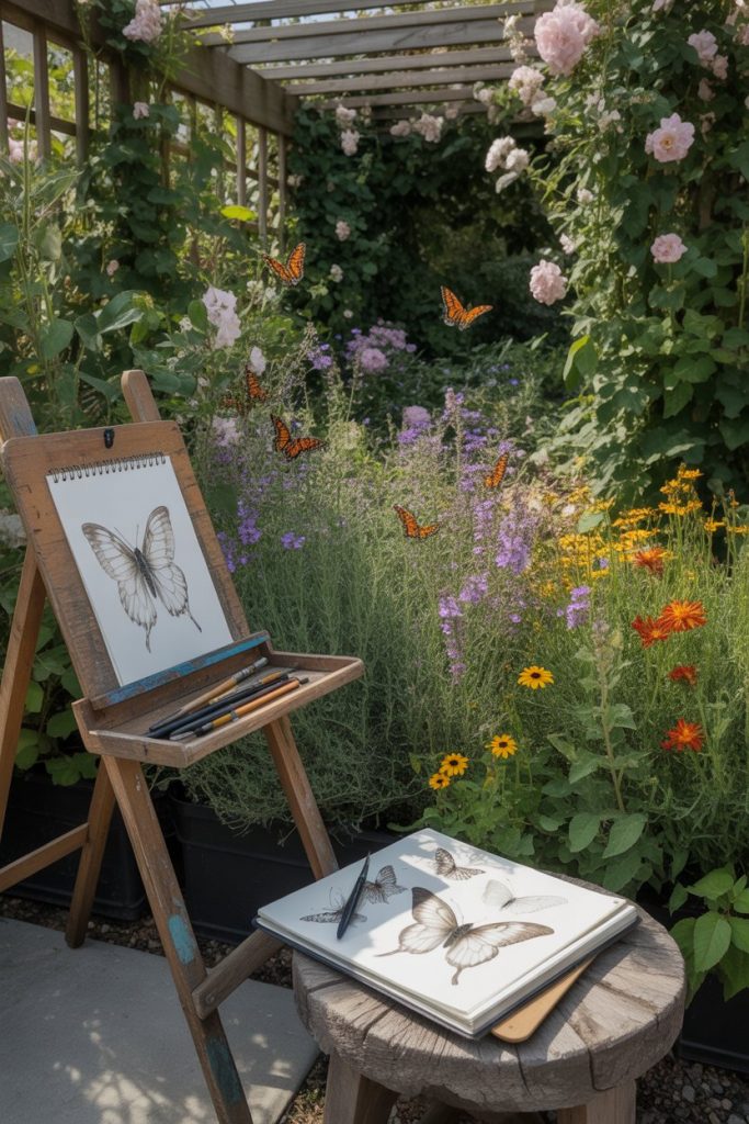 Artists often design garden corners inspired by tattoos, drawings, ideas, aesthetics, and designs, where shapes, colors, and wing patterns spark creativity. A neighbor of mine, who sketches outdoors, says butterfly gardens help her refresh her mind after long workdays. This idea works beautifully for any quiet area—a porch, a studio view, or a small courtyard—where plants create a living reference library for art. It’s a deeply personal, expressive garden style.