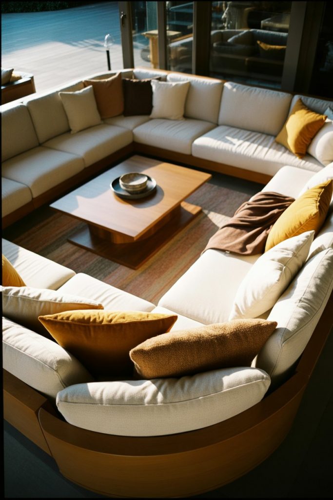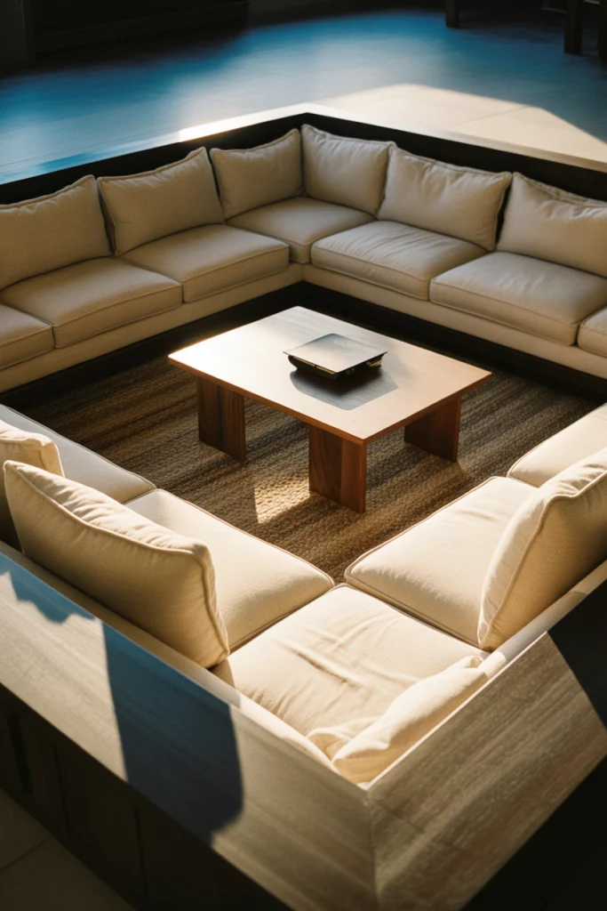 Inspired by mid century design, sunken living rooms create an intimate, lounge-like atmosphere. While true sunken floors aren’t feasible in most homes, you can mimic the effect with a large sectional arranged in a U-shape, paired with a low coffee table and plush area rug. The goal is to create a defined “pit” that feels separate from the rest of the space.
