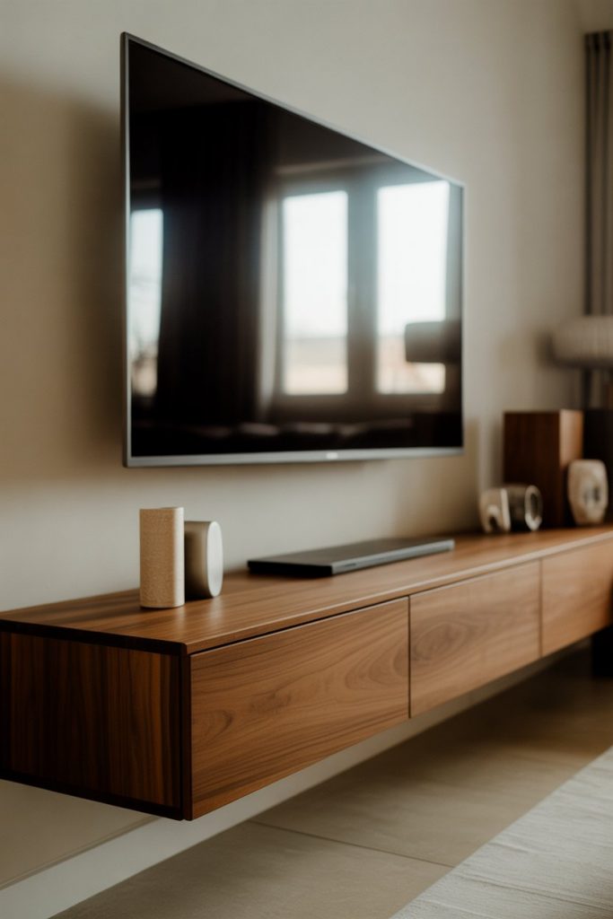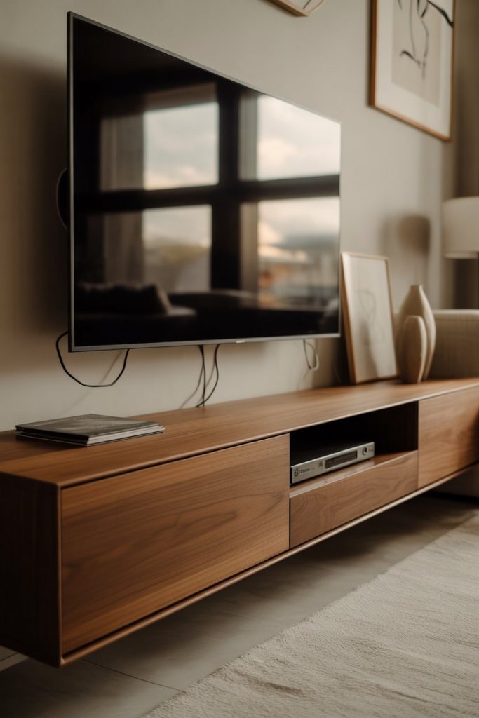 Wall-mounted TV unit designs free up floor space and create a clean, streamlined look. By lifting the console off the ground, you maintain sight lines and allow light to flow underneath, making the room feel larger. Pair it with hidden cable management and minimalist styling for a truly modern minimalist effect.