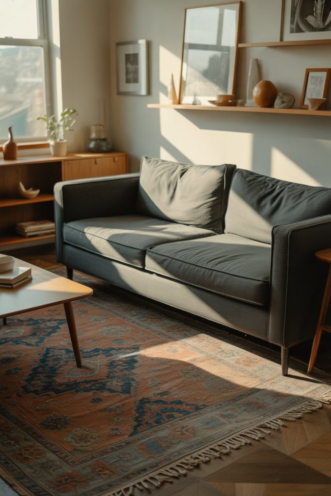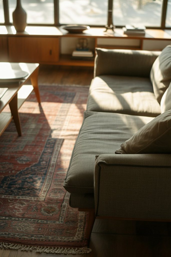 A vintage Persian or Turkish rug grounds a contemporary space with history and character. The faded colors and intricate patterns contrast beautifully with sleek modern furniture, preventing the room from feeling too sterile. This mix of old and new is a defining feature of transitional and eclectic styles.