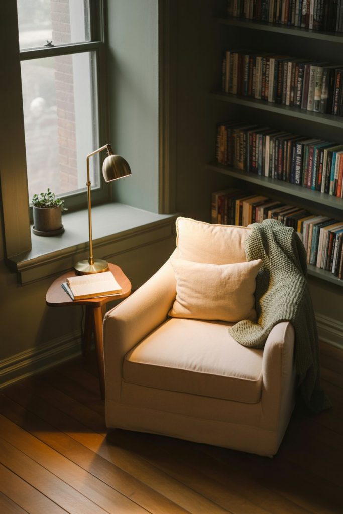 Carving out a dedicated corner for reading—complete with a comfortable chair, a small side table, and a task lamp—adds function and charm. This micro-zone works beautifully in apartment settings or larger living rooms where you want to create multiple activity areas. A cozy throw blanket and a small bookshelf complete the vignette.