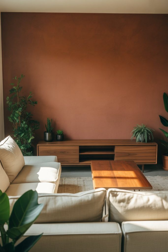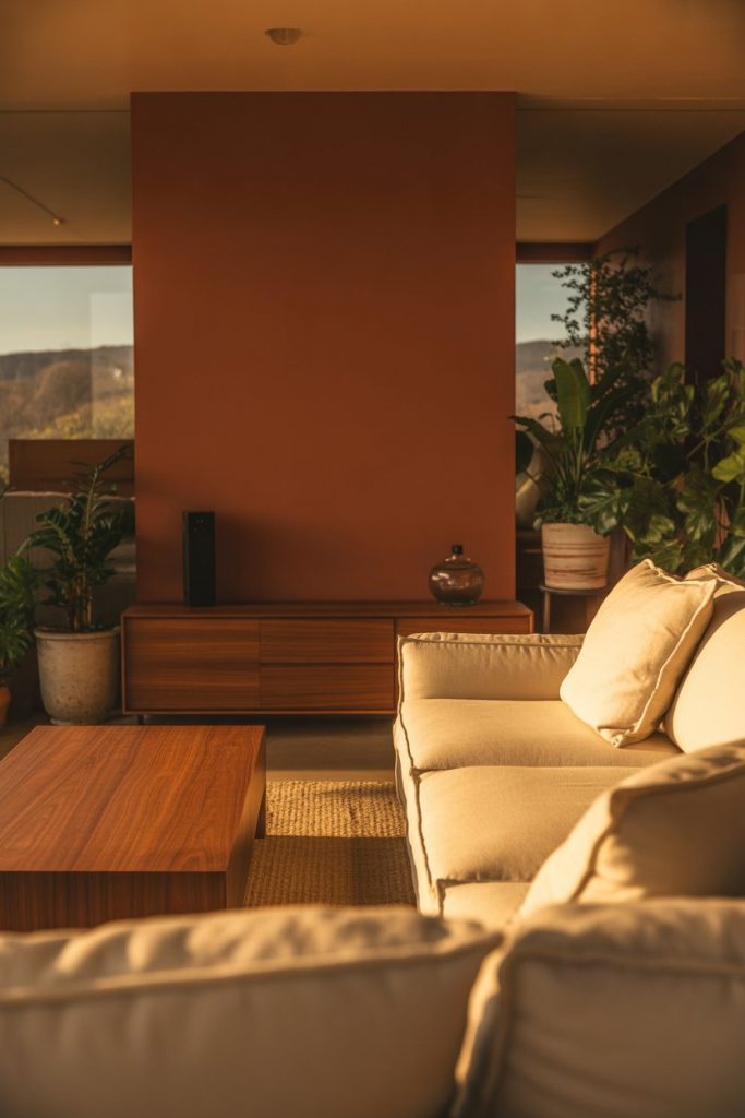 Terracotta accents—whether in pottery, throw pillows, or a feature wall—bring grounded warmth to a contemporary living room 2026 space. Combine this earthy hue with honey-toned wood furniture, like a walnut media console or teak side table, and you’ll achieve a look that feels both modern and timeless. The palette is forgiving, layering beautifully with cream, sage, and charcoal.