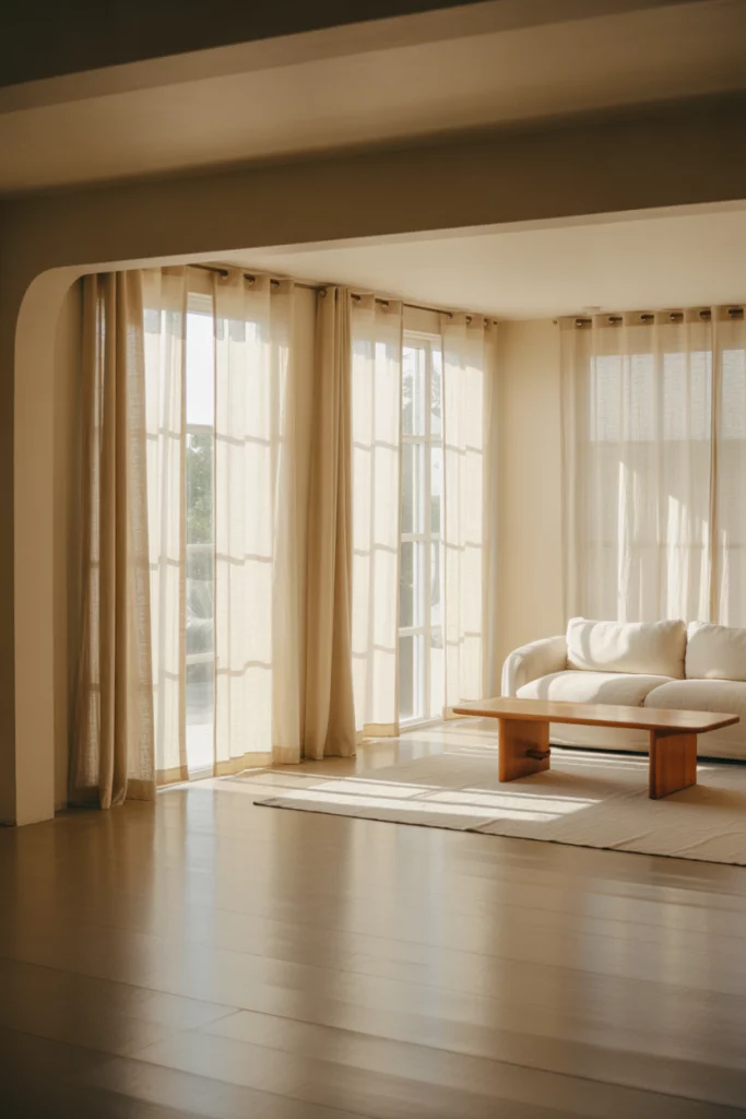 Floor-to-ceiling windows paired with sheer linen curtains flood a room with light while maintaining privacy. This approach is central to coastal and modern aesthetics alike, creating an airy, open feel. The key is hanging curtains high and wide—mount them just below the ceiling and extend the rod beyond the window frame.