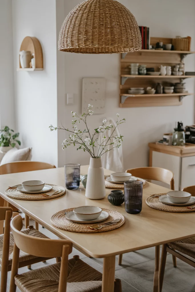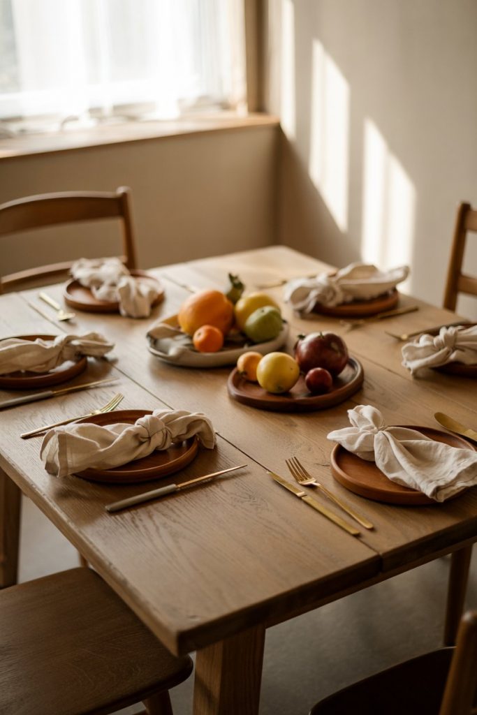 Everyday simplicity and comfort can be a source of beauty too. A wooden square or rectangular table with linen napkins, handmade ceramics, and a bit of greenery are all harmonious pieces of decor. This unpretentious configuration speaks to the rhythm of real life and is ideal for homes where comfort is celebrated over the pursuit of perfection.