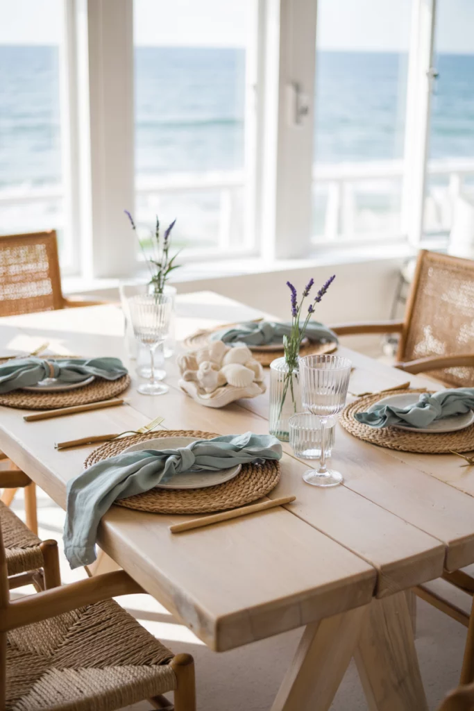 Outfitting your home with a coastal aesthetic can be accomplished through various designs that incorporate a blend of white and wood elements. This relaxed design features weathered wooden tables, light linens, and woven placemats. The aesthetic of relaxed, salty air can uplift your home for summer brunches or beach-inspired decor without the fuss of overdecorating.