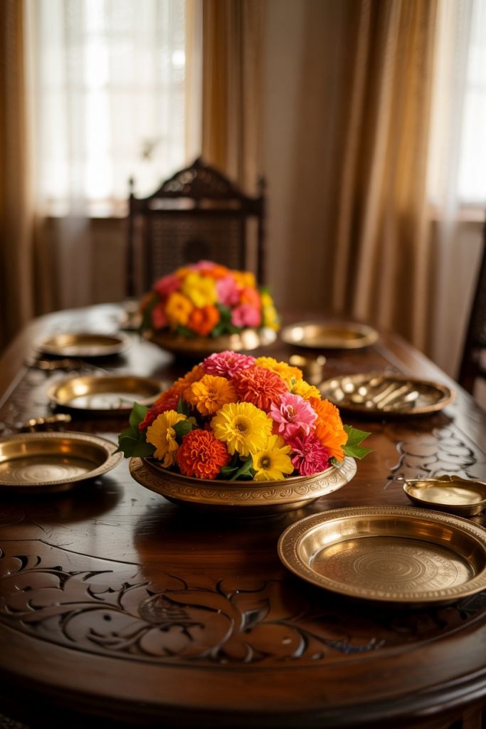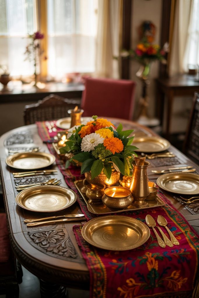 The Indian home celebrates festivity even in dining decor. An innovation of brass plates, colored fabrics, and a wooden oval table conveys the art form. To remember your roots, marigold and candle centerpieces harmonize with the modern aesthetics. It celebrates the culture with warmth and elegance throughout the year.