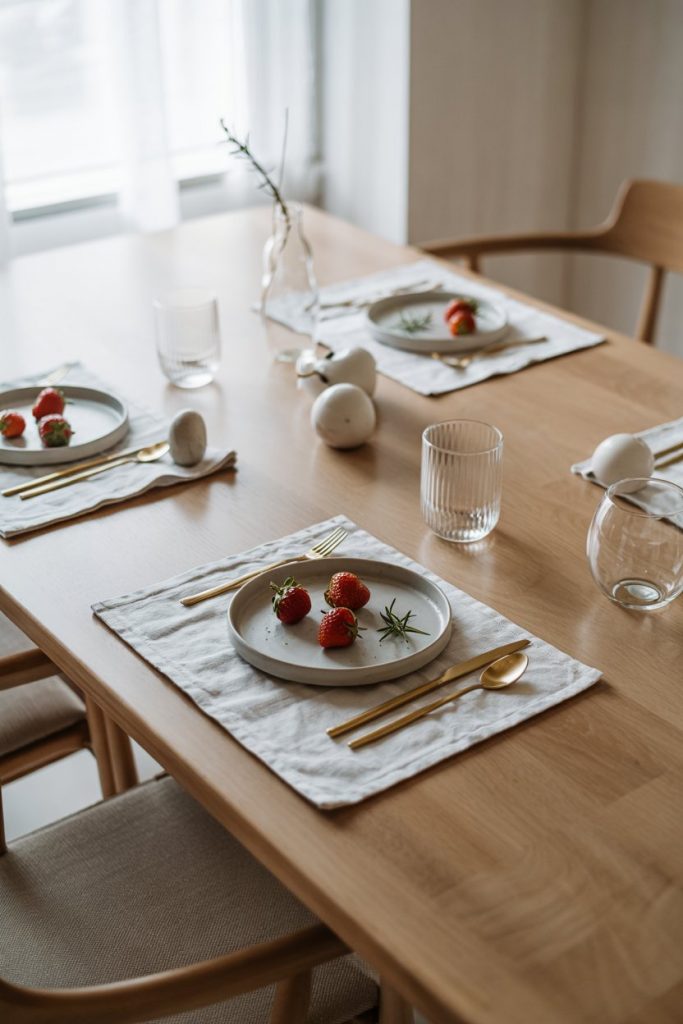 The Scandinavian influence thrives in 2026, defined by light wood, neutral tones, and simplicity. A square or rectangular table with linen and ceramic dishes sets a balanced tone. This simple design celebrates peace, functionality, and natural materials—a haven for minimalist living.