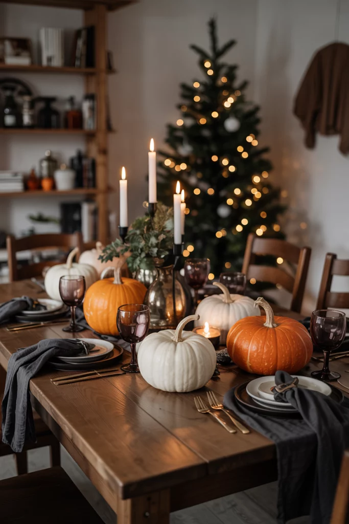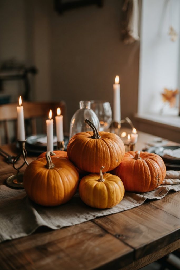 For Halloween, blend rustic charm with eerie flair. Use a farmhouse wooden table, dark linens, and moody lighting. Add pumpkins or dried flowers for a stylish seasonal centerpiece. It’s spooky yet homey—perfect for family fun nights with subtle drama and creativity.